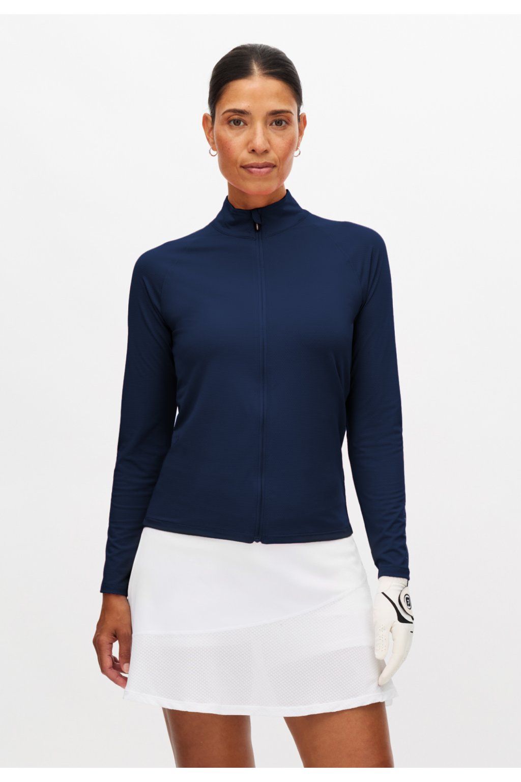 Dámská funkční mikina NICKY má polo-přiléhavý střih a je vyrobena z lehkého, prodyšného a stretchového materiálu s pružnou jaquardovou strukturou. Mikina má stojáček u krku, zip po celé délce a logo RÖHNISCH na rukávě. Ochrana UPF 50+. Mikina je navržena jako střední nebo vrchní vrstva ve skladbě oblečení. Mikina má vynikající střih a pěkně tvaruje postavu. Pro její krásný design a variabilitu použití ji oceníte i mimo golfové hřiště, jde velmi dobře kombinovat s jakýmikoliv kalhotami nebo sukní a šaty. Velkým plus i pro běžné nošení jsou funkční vlastnosti a pohodlí.