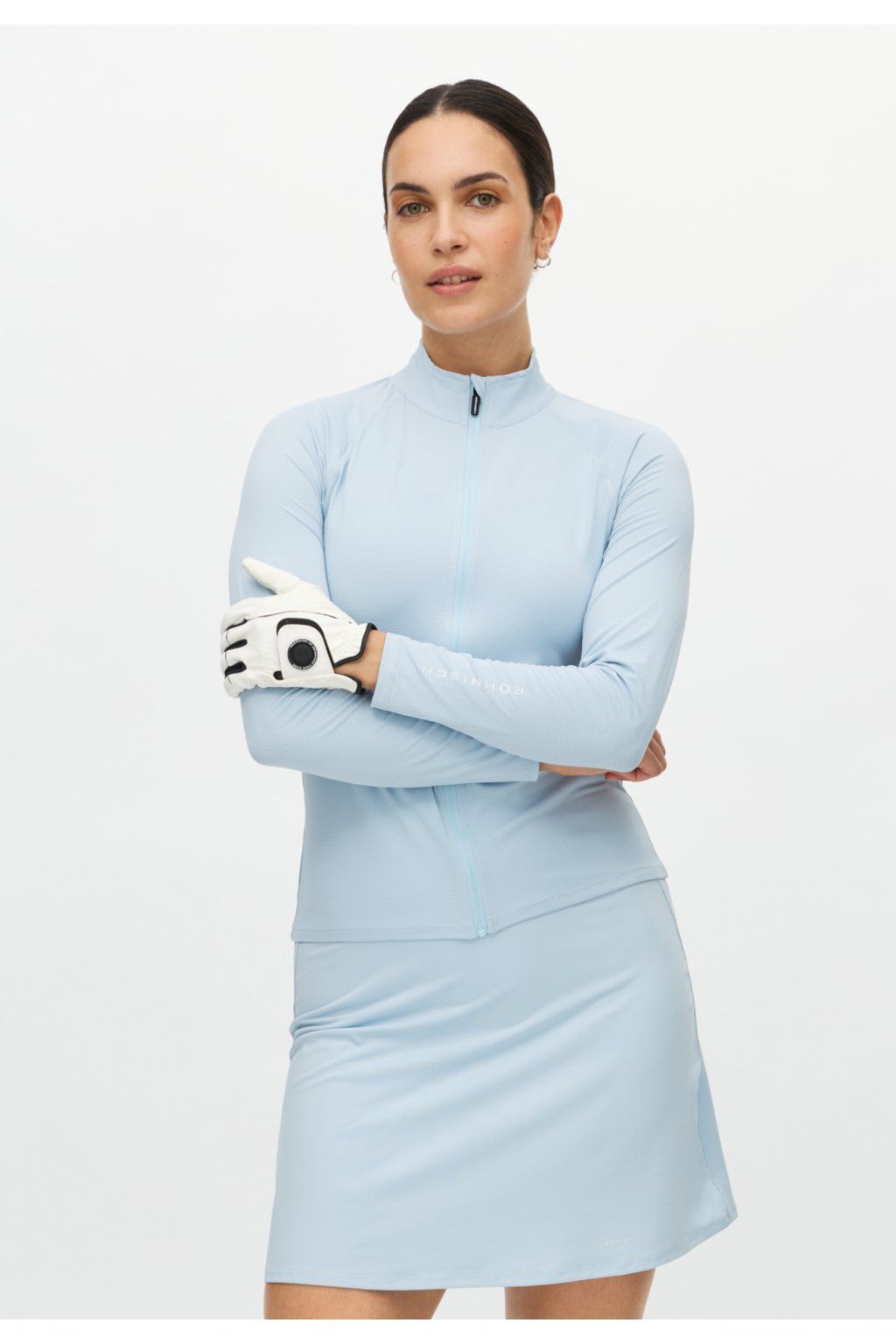 Dámská funkční mikina NICKY má polo-přiléhavý střih a je vyrobena z lehkého, prodyšného a stretchového materiálu s pružnou jaquardovou strukturou. Mikina má stojáček u krku, zip po celé délce a logo RÖHNISCH na rukávě. Ochrana UPF 50+. Mikina je navržena jako střední nebo vrchní vrstva ve skladbě oblečení. Mikina má vynikající střih a pěkně tvaruje postavu. Pro její krásný design a variabilitu použití ji oceníte i mimo golfové hřiště, jde velmi dobře kombinovat s jakýmikoliv kalhotami nebo sukní a šaty. Velkým plus i pro běžné nošení jsou funkční vlastnosti a pohodlí.